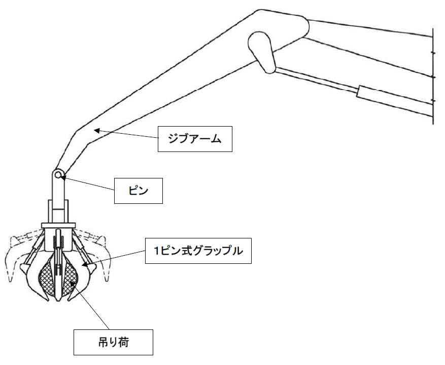 1ピン式グラップルはつかみ機本体の構成として、別紙(参考図)のとおり、ジブアームに対し強固なピン接続により恒久的に連結され、機械全体として一体的に設計・構成されている。このため、機械の転倒や荷のぶれ等に対する安全性も当該構造により十分に確保されていると認識している。よって、1ピン式グラップルは、つり具ではなく、ジブアームの一部である。