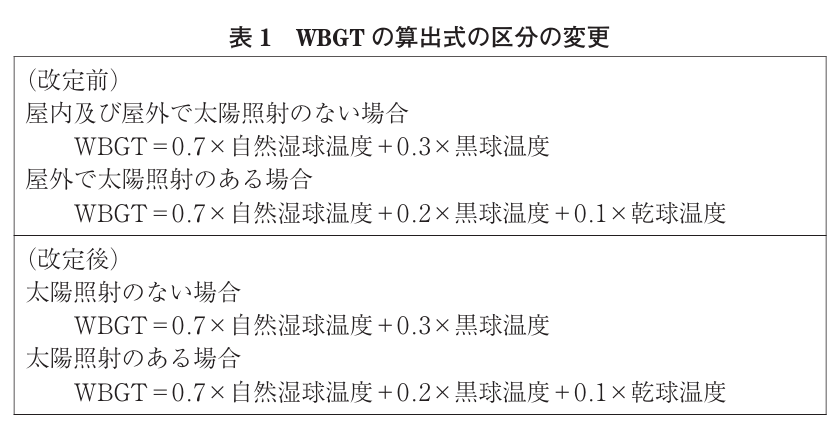 従来、WBGTの算出式は、「屋内及び屋外で太陽照射のない場合」と「屋外で太陽照射のある場合」の2区分によって異なる算出式が規定されていた。これは改定前のJIS Z 8504:1999によるものであったが、改定後のJIS Z 8504:2021にて算出式の区分が変更となったことから、「日射のない場合」と「日射のある場合」に変更となった。すなわち、屋外・屋内という「測定場所による区分」ではなく、「日射の有無」による区分となっている。