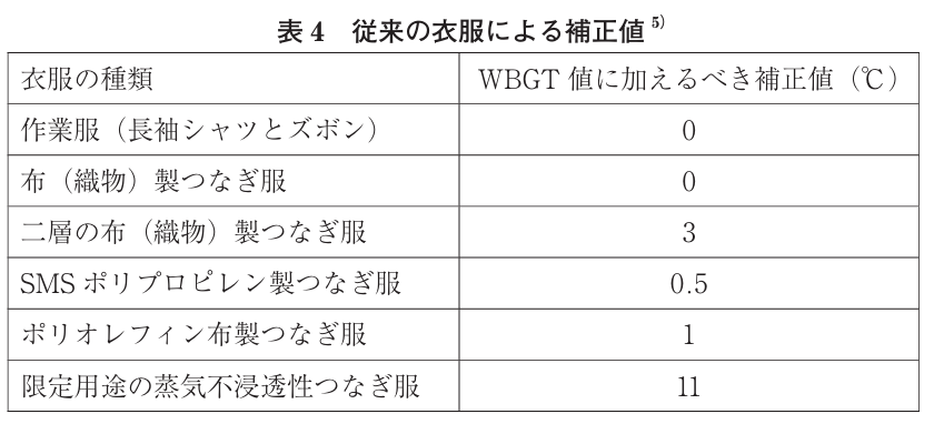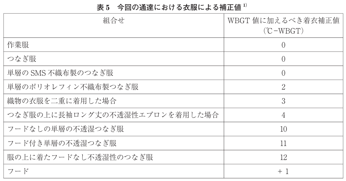 この表の使い方としては、①作業者が着用している作業服に応じて、測定されたWBGT値に上乗せする(作業者別の対応)、②着用している作業服に応じて、WBGT基準値表自体を書き換える(作業場所別の対応)が考えられる。作業者によって着衣状況が異なる場合は①、特定の作業場における着衣が決まっている場合は②がお勧めである。