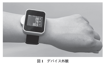 そこで我々は、信州大学医学部と共同で、発汗量の変化を高度にセンシングする小型センサ技術を実現し、それを用いて、適切な水分補給を促すウェアラブルデバイスを開発した。図1は、開発デバイスである『熱中症対策デバイス WLS―1000』(以下、「本機」という)の外観である。