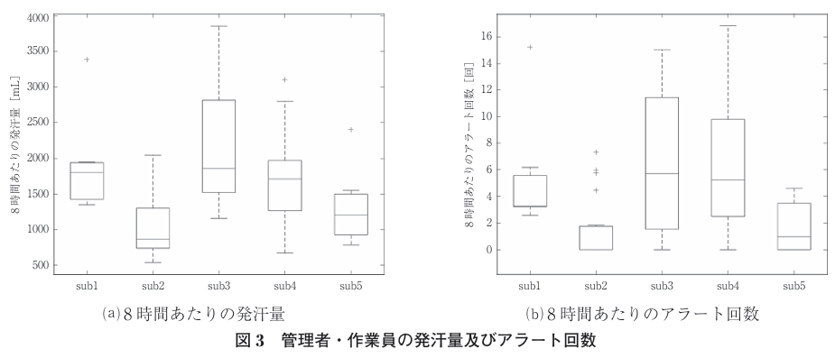 図3(a)に管理者・作業員の発汗量、図3(b)にアラート回数の比較を示す。被験者は、活動量の多い 管 理 者(sub1)、 活 動 量 の 少 な い 管 理 者(sub2)、活動量の多い作業員(sub3、4)、活動量の少ない作業員(sub5)となっている。活動量(業務内容)によりばらつきがあるものの、管理者に比べ作業員は発汗量が多く、2から3倍程度となることもある。一方で、1日の給水量をアンケートにより取得したところ、活動量の多い管理者(sub1)が2L 程度摂取しているのに対し、活動量の多い作業員(sub3、4)は1L 程度であった。作業員は作業中に水分補給を行うタイミングが限られているという声も聞かれ、脱水のリスクが高いと考えられた。結果として、アラートの回数も多くなる傾向が確認された。