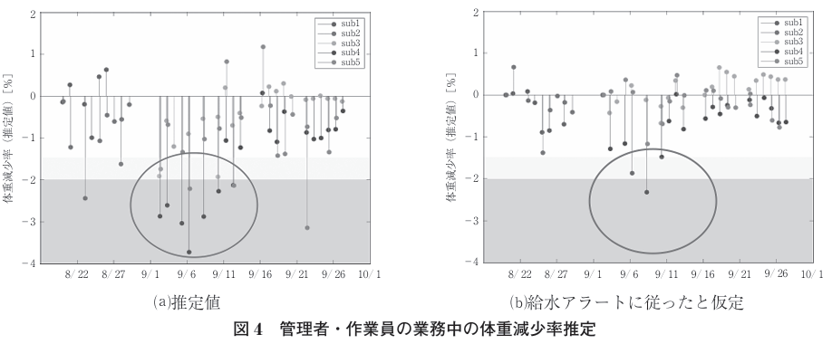 給水アラートが提示されたときに、100ml(g)の水分摂取を推奨しており、給水アラートに従い、水分補給を行ったと仮定し、水収支(水分の排出と摂取のバランス)を再計算した結果を図4(b)に示す。図4(b)のように暑熱曝露限界を超えると推定される日は大きく減少することが確認された。給水アラートに従い、適切な水分補給を行うことで、脱水リスクを軽減することができるといえる。