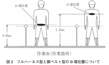 フルハーネス型,及び胴ベルト型のフックを“D環取付高さ”の構造物にフックを掛けた場合,自由落下距離(墜落阻止時にランヤードが緊張し,ショックアブソーバが作動するまでの距離)は,ほぼ同じ長さとなる。従って同じ仕様のランヤードを用いた場合には,胴ベルト型とフルハーネス型の落下距離には大きな差はない(