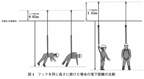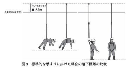 従って,標準的な手すり高さ(0.85m)にフックを掛けた場合には,フルハーネス型が胴ベルト型に比べ落下距離は長くなる(