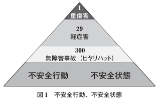 ハインリッヒの法則では,300件のヒヤリハットをなくせば,重大事故も無くなるといわれているが,実際の現場にはヒヤリハットにもならない不安全状態や不安全行動が無数に存在している(図1)。