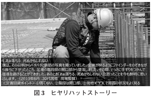 文章と写真で伝える資料では,実際にヒヤリハットを経験した本人にヒアリングを行い,その人がその瞬間に感じた気持ちをリアルに伝えるようにした。感情のこもらない統計資料ではなく,「あぁ,落ちる,死ぬかもしれない」といったその人の言葉をそのまま伝えるようにした。モノクロの写真と生の言葉は,朝礼でマイクを使って発表するよりも見る人の心に届く。自分もそれによく似たヒヤリハットを経験したと思う人も多く,そこに共感が生まれる。この共感こそが自分事として受け止める動機づけになるのだ(図3)。 このストーリーを休憩所に貼りだすだけではなく,ラミネート加工し,現場の同じシチュエーションの場所に掲示するようにした。ふと手を休めたときに目に入ってくるヒヤリハットストーリーが今まさにやろうとしている現場の状況とリンクし,作業員の心に響くからだ。