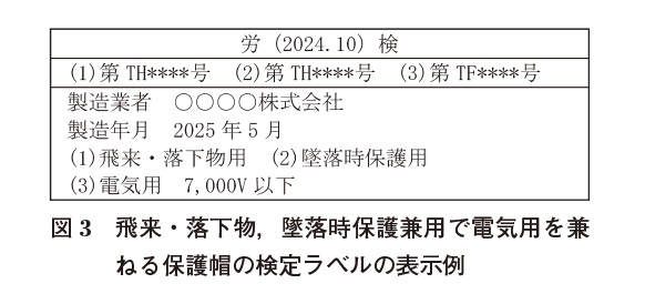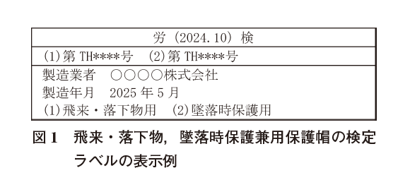試験機関による検定試験に合格すると、TFから始まる型式検定合格番号が付与され、検定ラベルに「保護帽の規格」に基づく検定番号と併記するよう定められている(