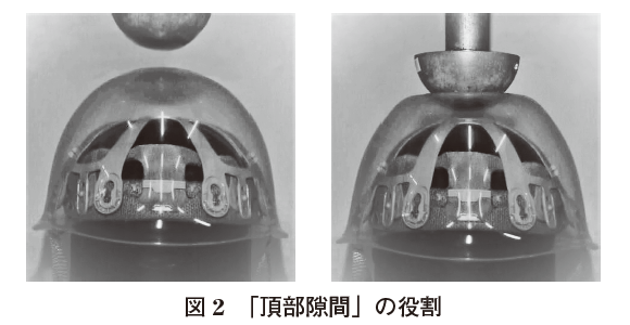 図2で示したように、ヘルメットの衝撃吸収メカニズムにとって「頂部隙間」は非常に重要な役割を持つ。これを十分に取る必要があるために、結果としてヘルメットの帽体が頭部から持ち上がってしまうのである。