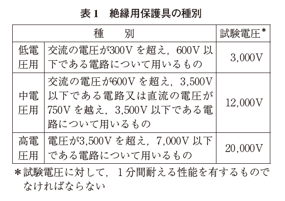 労働安全衛生規則351条では、絶縁用保護具等を使用する際に、6ヶ月ごとの耐電圧性能に関する定期自主検査を義務付けている。