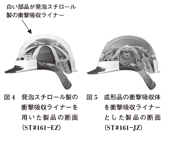 近年、ヘルメット内部の空間を広げて通気性を向上させるため、発泡スチロールの代わりにプラスチック製の衝撃吸収体を用いた、