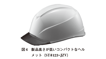 さらに、このヘルメットは製品高さを低くすることにより帽体の表面積が減少し、大幅な軽量化を実現した。図5のST#161―JZVの質量が430gであるのに対して、図6のST#123―JZVは365gである。また、同形のヘルメットにシールド面が付いたST#123VJ―SHでも、図5のヘルメットと同じ430gである。