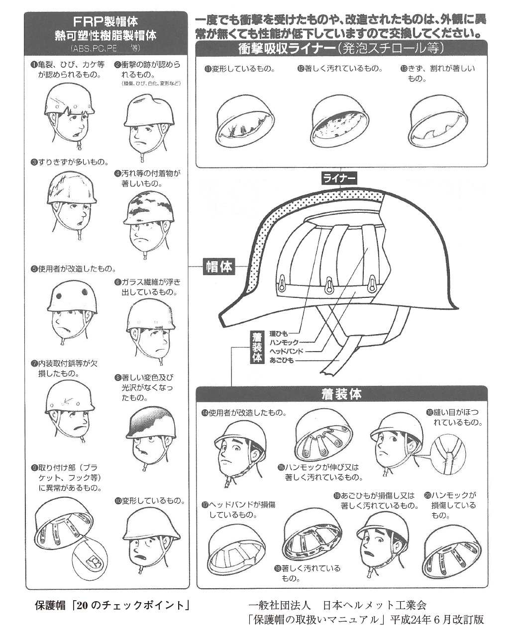 ヘルメットは「20のチェックポイント」(次ページ参照)によって点検し、少しでも異常が認められた場合は使用を中止すべきである。この表は一般社団法人日本ヘルメット工業会が定めたものである。