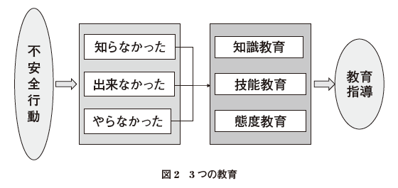 また、労働災害の原因となっている不安全行動をなくすために、職長は、部下の教育を行うに当たっては、「知識教育」(知らないことの解決)、「技能教育」(できないことの解決)および「態度教育」(やる気のなさの解決)の3つを切り口とした教育を行う必要がある(図2)。