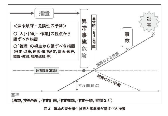 職場には、建設物、設備、原材料、作業方法などあらゆる場や状況において、危険性あるいは有害性(リスク)が潜在して(隠れて)おり、それが時間的な経過の中において顕在化する(見えてくる)、すなわち「異常」な状態となる。この異常とは、法規、指針・作業標準などで定められている基準からずれていく、すなわち「正常」な範囲を超えた状態をいい、この状態をそのままにしていくと、いずれはトラブル→事故→災害となる(図3)。