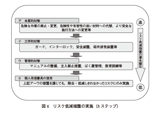 職場の安全衛生を確保する基本は、設備・機械の「本質安全化」が図られていることである。すなわち、図4で示すように、まず、職場から危険・有害なものをなくす、あるいはその危険性・有害性が極めて低いものに替えることが基本である。職長は、職場のリーダーとして、リスクアセスメントの実施等において全員でリスクをなくす活動を行うに際して、まずはこの本質安全化から検討を行うことを全員の共通の認識とすることが大切である。